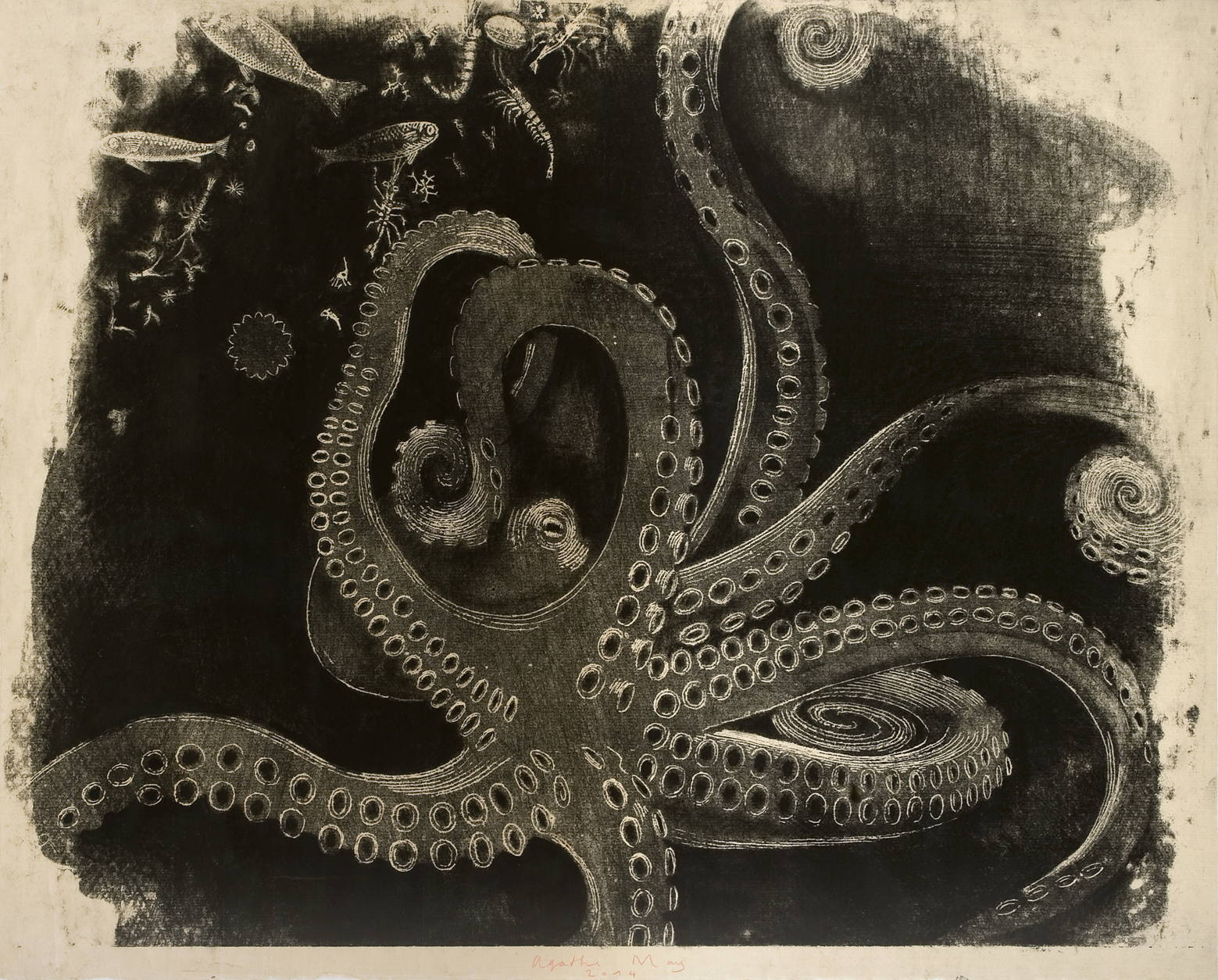 « Agathe May pratique en effet la gravure, mais d'une manière très singulière. Quand, après d'innombrables études et essais, la planche a été tirée, par elle-même, elle la rehausse de couleurs. Chacune est ainsi unique, au gré des expérimentations chromatiques. Le terme technique convenable est "monotype". »